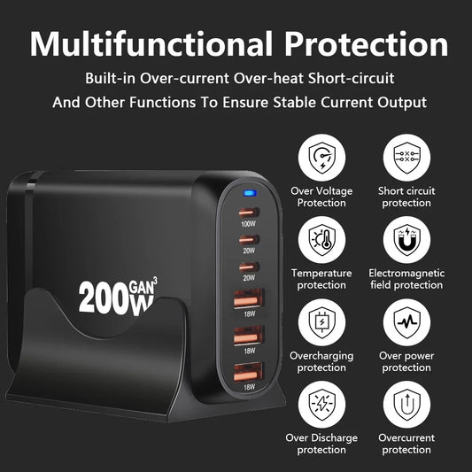 200W GaN Charger USB C Charger Multi-Ports Charging Station For MacBook iPhone Samsung iPad Type C PD Charger Quick Charge 3.0