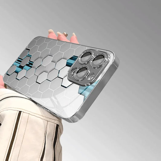 Silver Gradient Honeycomb Pattern Glass Electroplated Phone Case For iPhone 17 16 15 Pro Max 14 Plus 13 12 11 16E 17 Air Cover