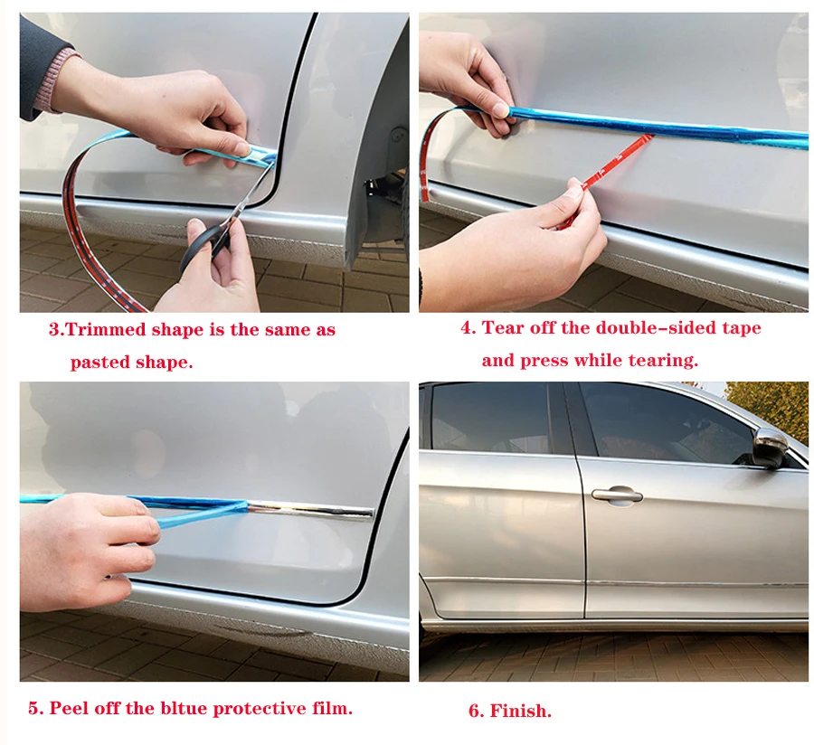 EASY TO INSTALL - This car door protector Built-in strong double-sided adhesive tape and does not melt under hot weather, no glue needed, Super easy to cut with scissors. The adhesive tape is designed to paste on the inside door edge, therefore it will not leave any residue on the outside door after the door trim is removed.