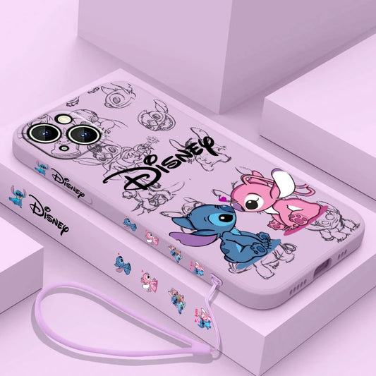 Disney Super Cute Stitch Phone Case For Apple iPhone 15 14 13 12 11 Pro Max Plus 8 7 SE Liquid Left Rope Soft Cover