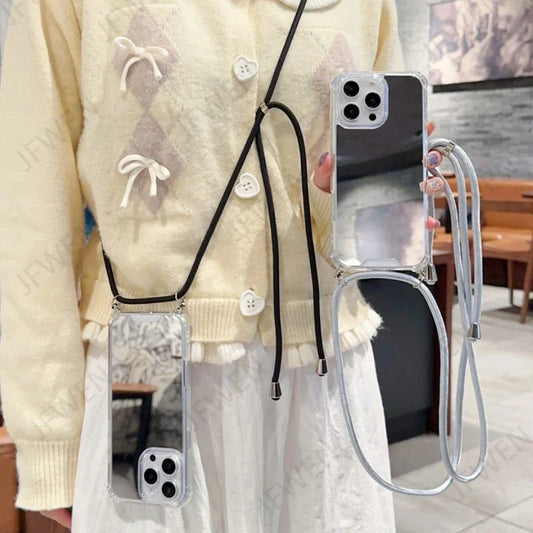 Crossbody Lanyard Mirror Phone Case For iphone 16 15 14 13 12 Mini 11 Pro Max XS XR SE 2 3 8 7 Plus Hard PC Back Cover