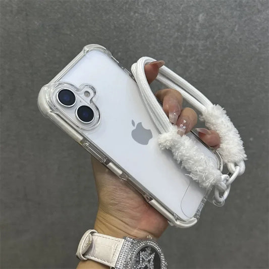 Hybrid Color Transparent Armor Case For iPhone 16 15 14 11 12 13 Pro Max Plus X Xr Xs Plush Wrist Strap Airbag Shockproof Cover