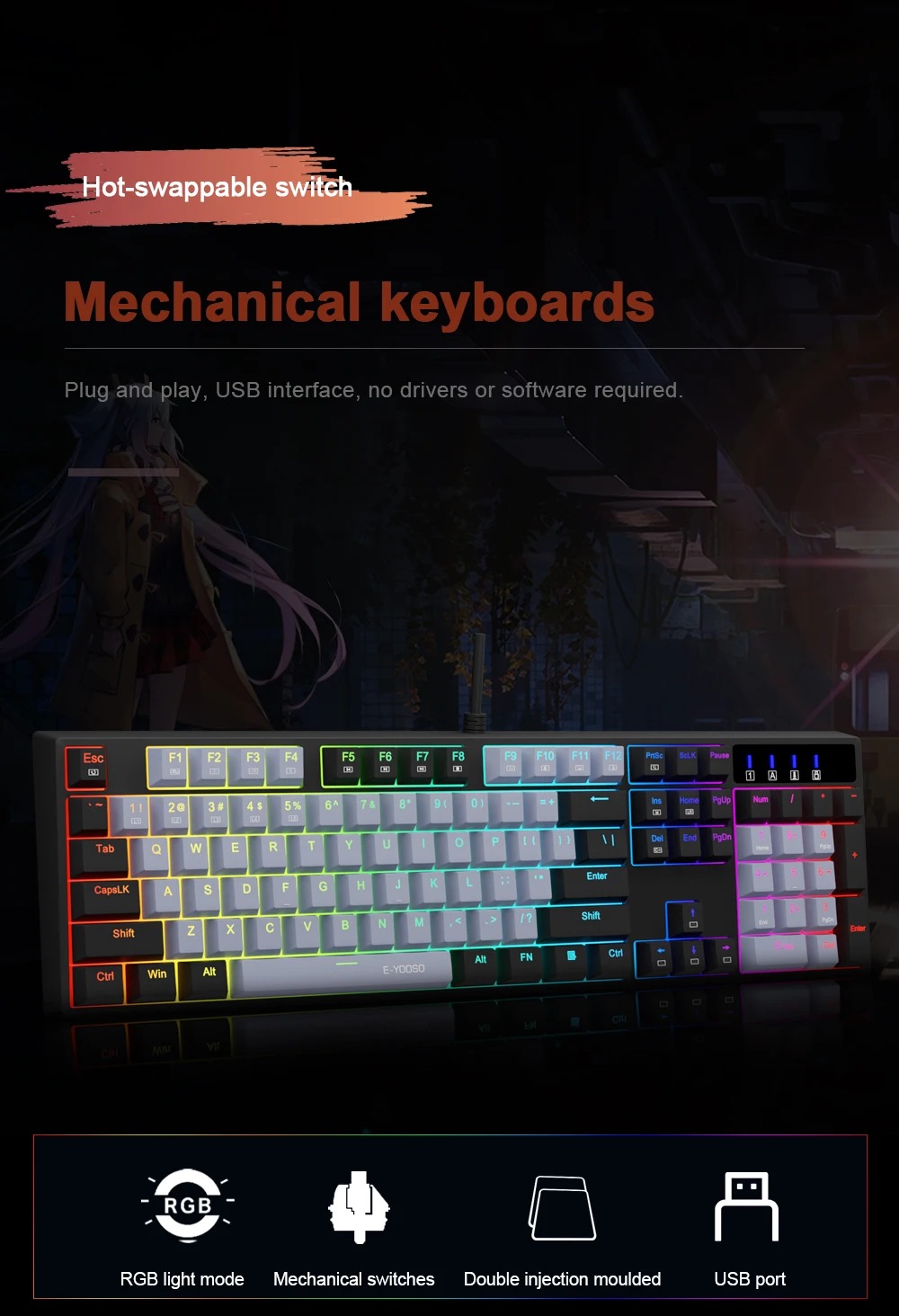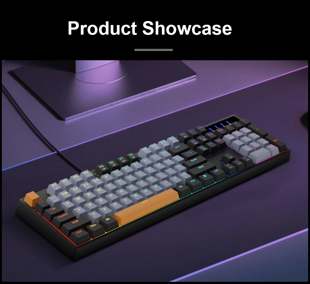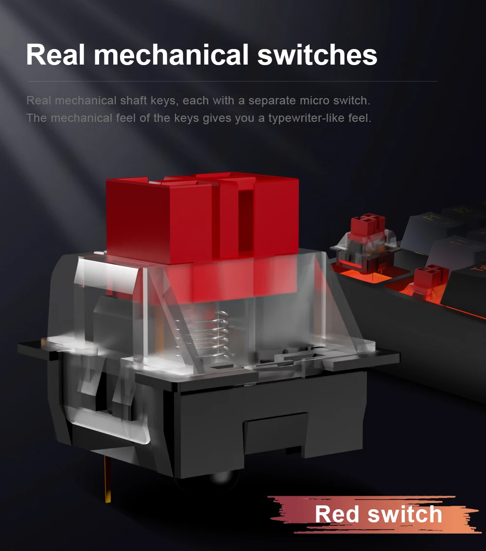Professional Red Switches: gaming keyboard is equipped with pluggable red switches, which are linear, top-to-bottom switches. These switches require less force to press down and the keys feel smoother and easier to use. No tactile "bump" but responsive. A great choice for work and play!