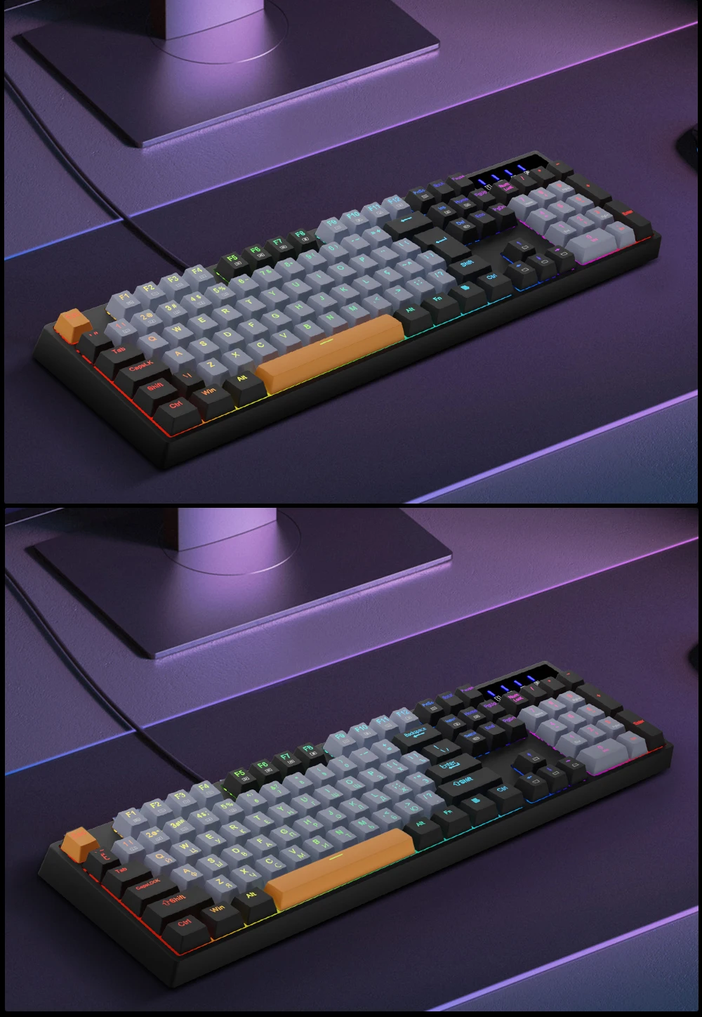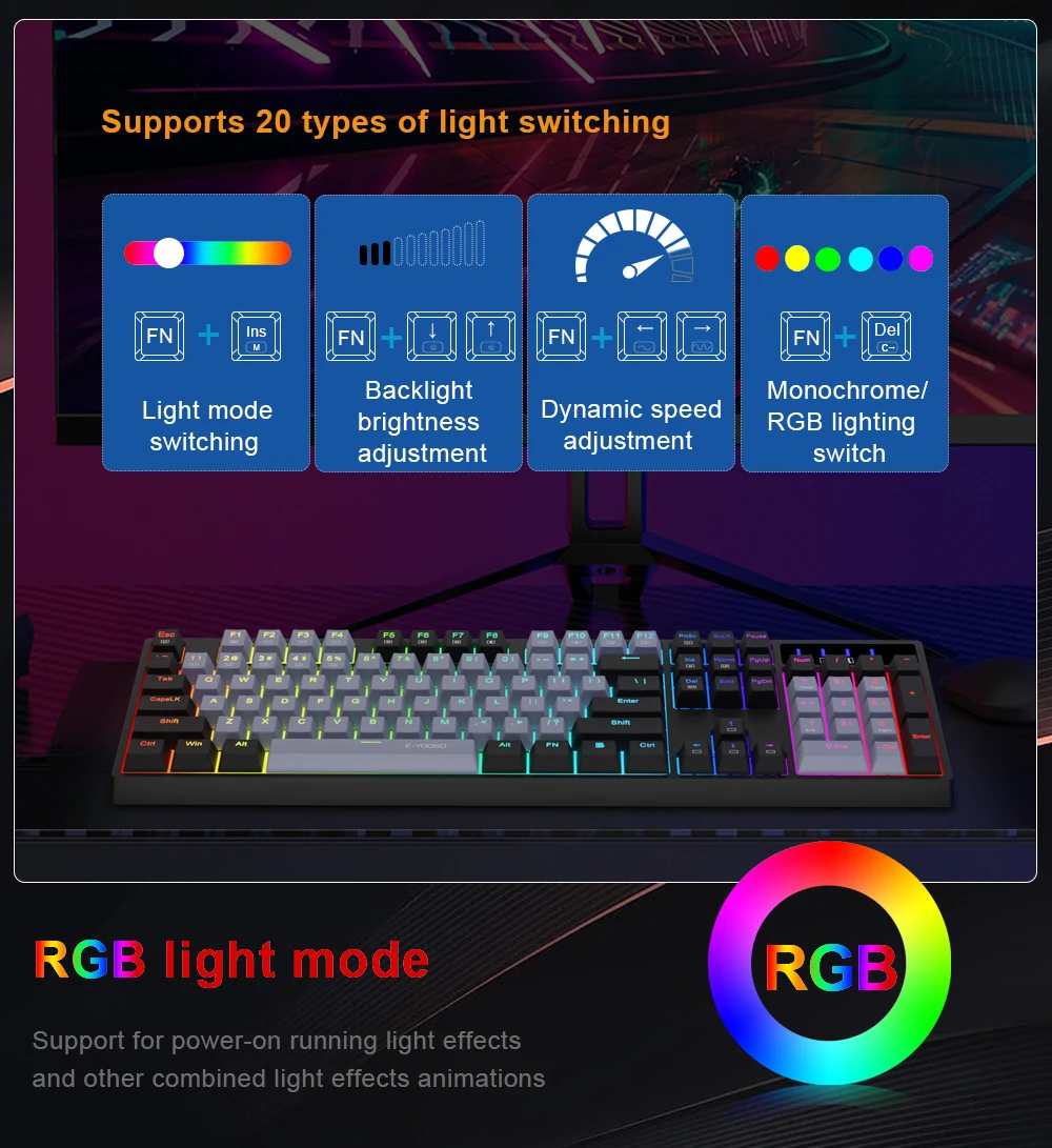 Dynamic RGB Backlight: 15 backlight models allow you to type in the dark. You can adjust its brightness with FN + Ins/Del. Arrow Key in any non-breathing mode.