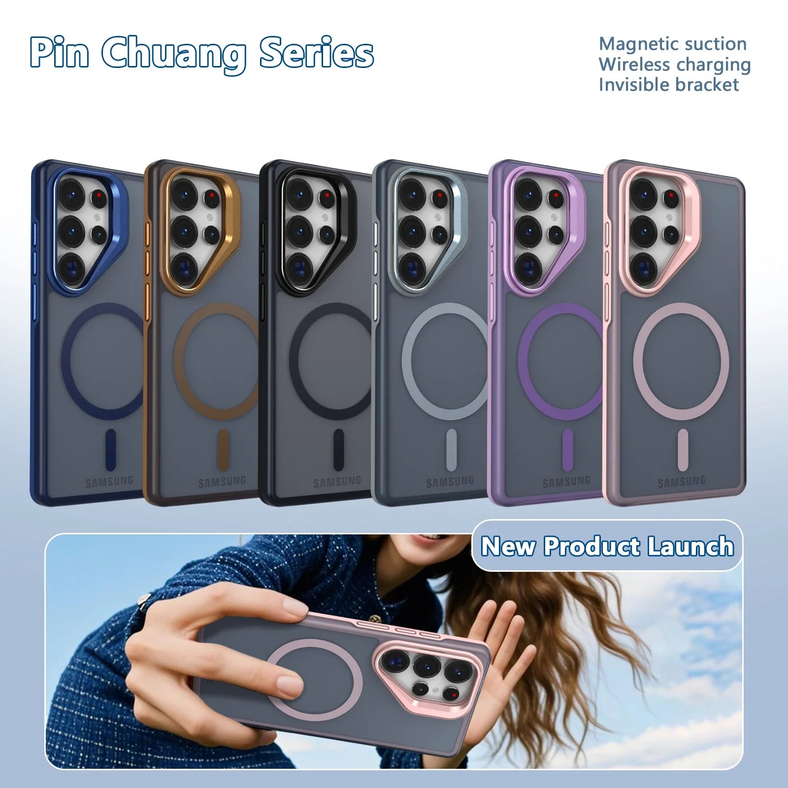 Luxury Matte Clear With Holder Magnetic Magsafe Case For Samsung Galaxy S25 S24 S23 S22 Ultra Plus S25Edge S24FE S25FE Cover