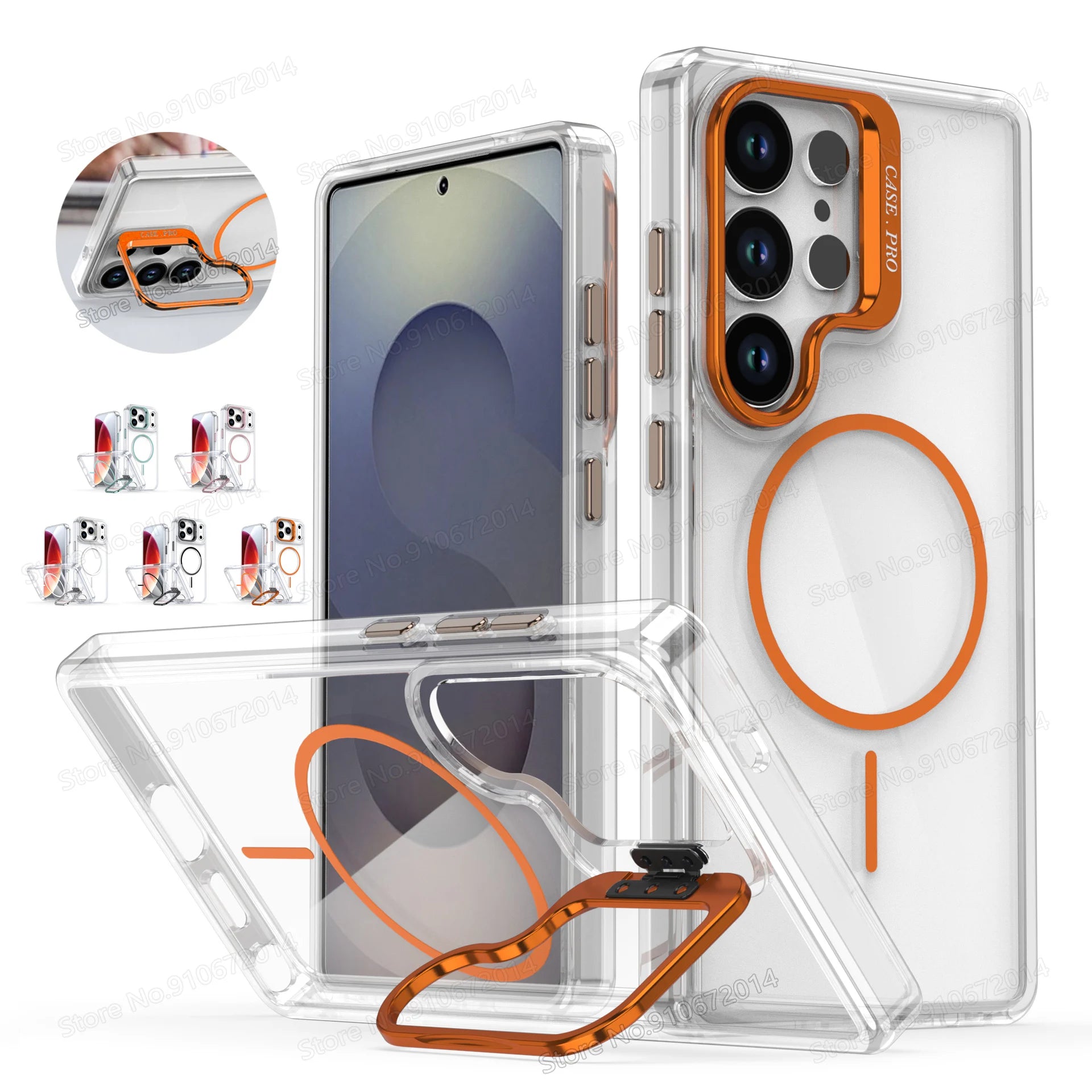 Model 1: Funda For Samsung Galaxy S25 Ultra Camera Frame Folding Bracket Magnetic Charging Transparent Phone Case Cover