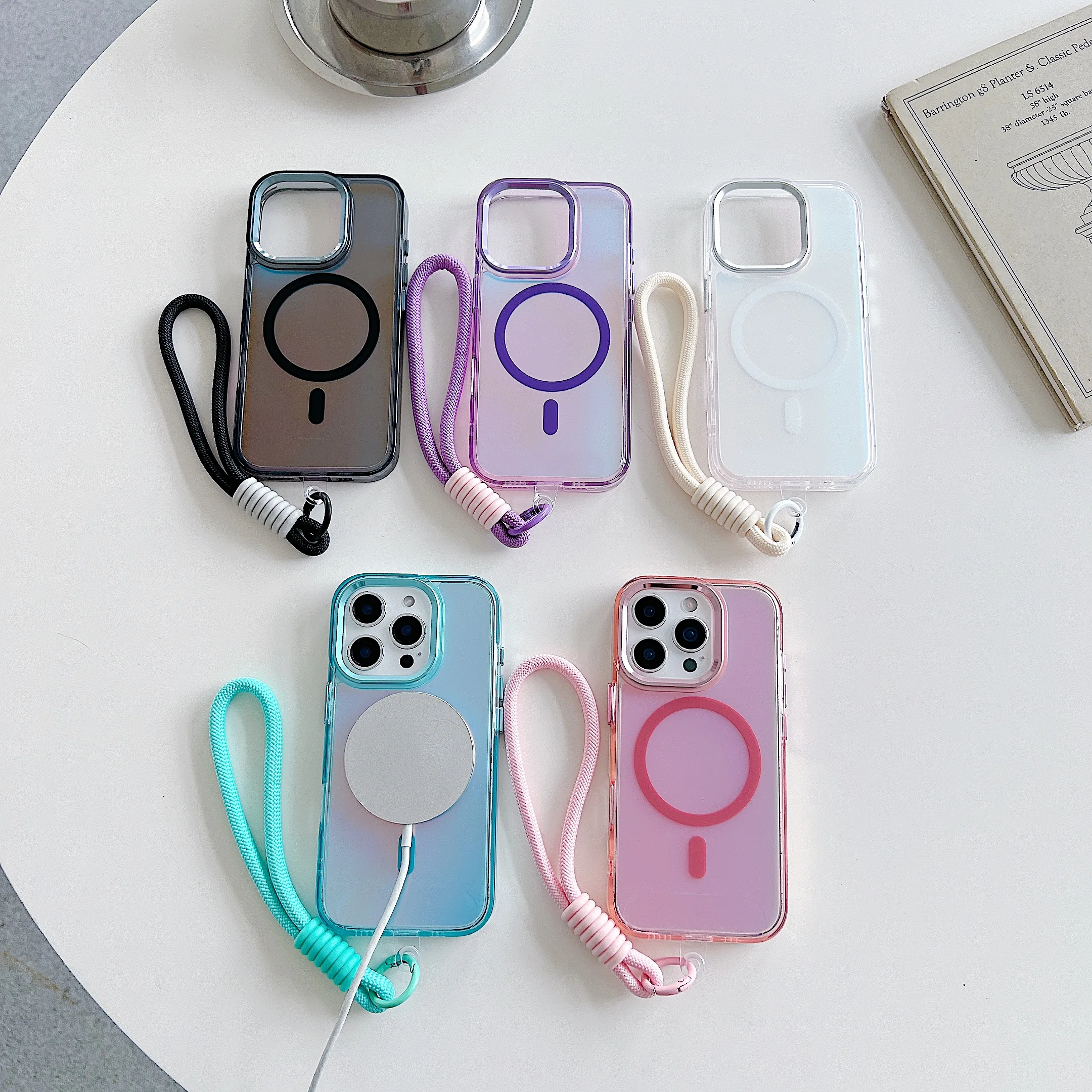 Fashion Laser Gradient Magnetic Lanyard Shockproof Case for iPhone 17 Air 16 15 14 13 11 12 Pro Max Plus E For Magsafe Cover