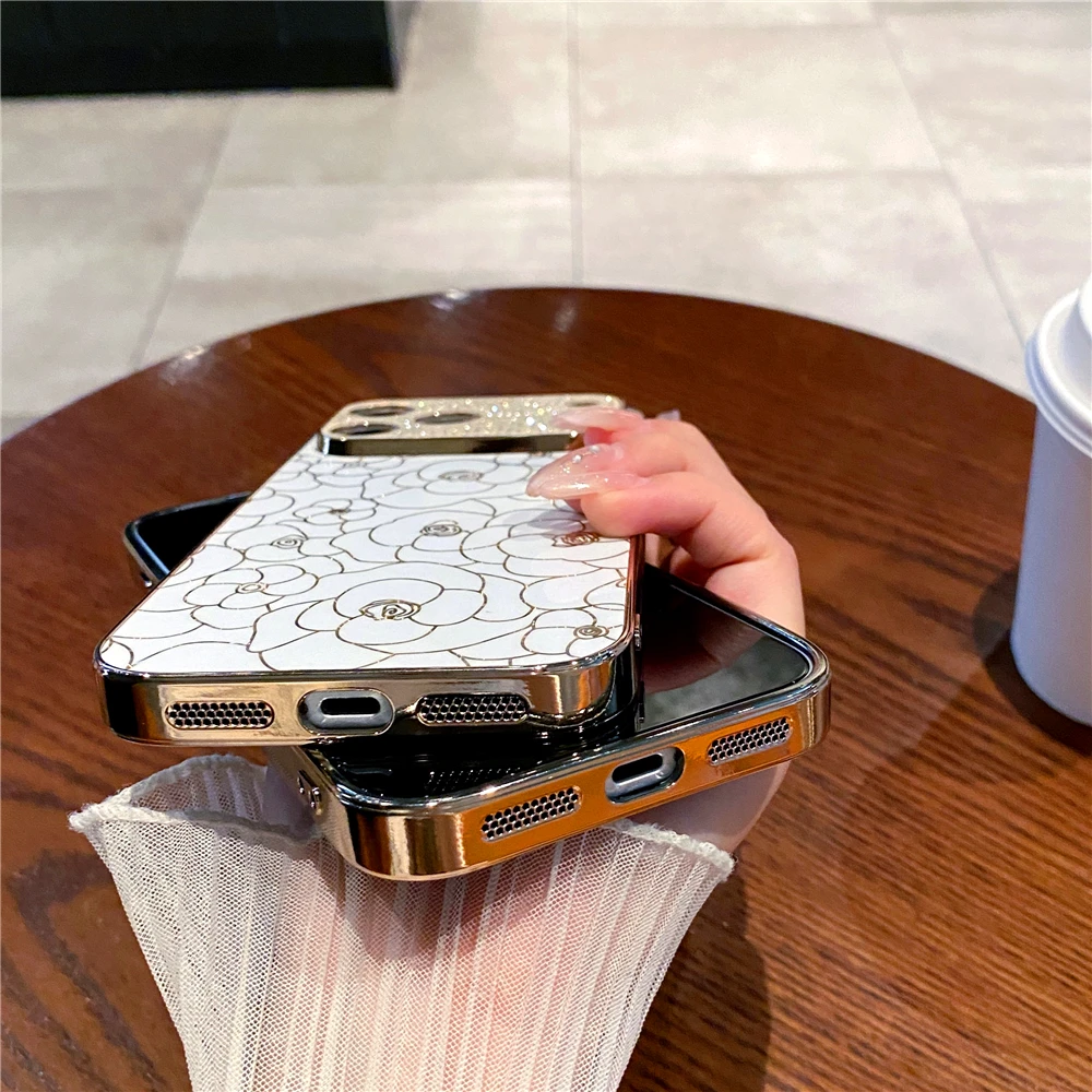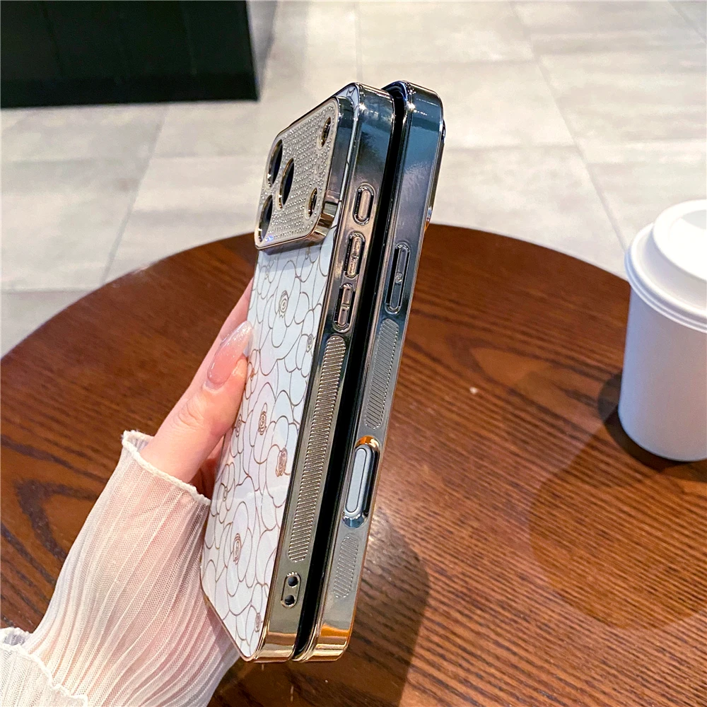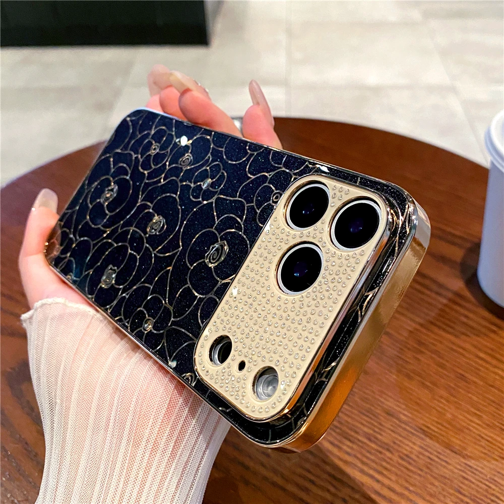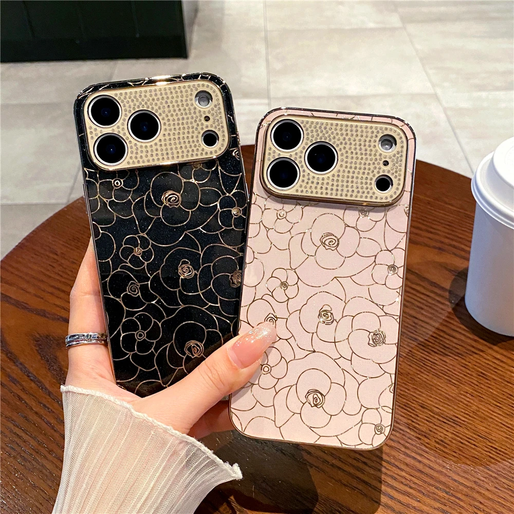 Luxury Plating Diamond Cover Glitter Gold Line Rose Flower Phone Case for iphone 17 PRO MAX 17 AIR 16 PRO MAX 16E 13 14 15 Plus