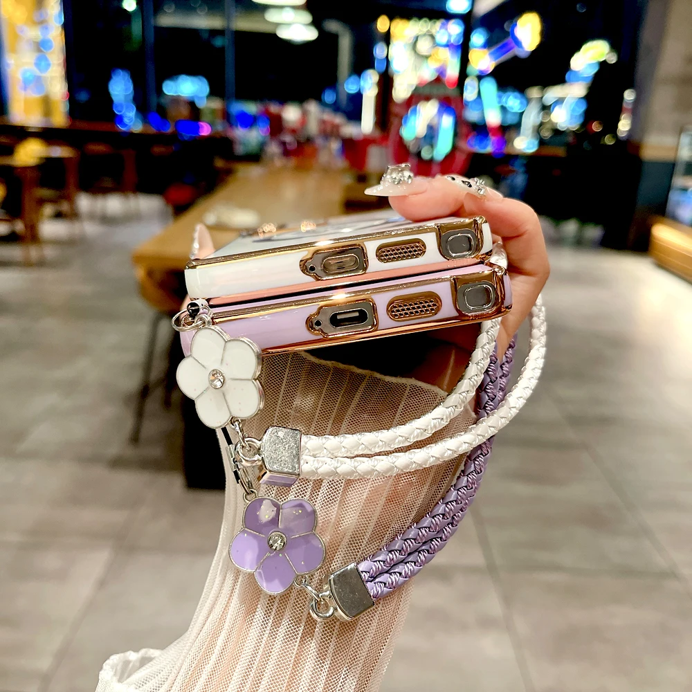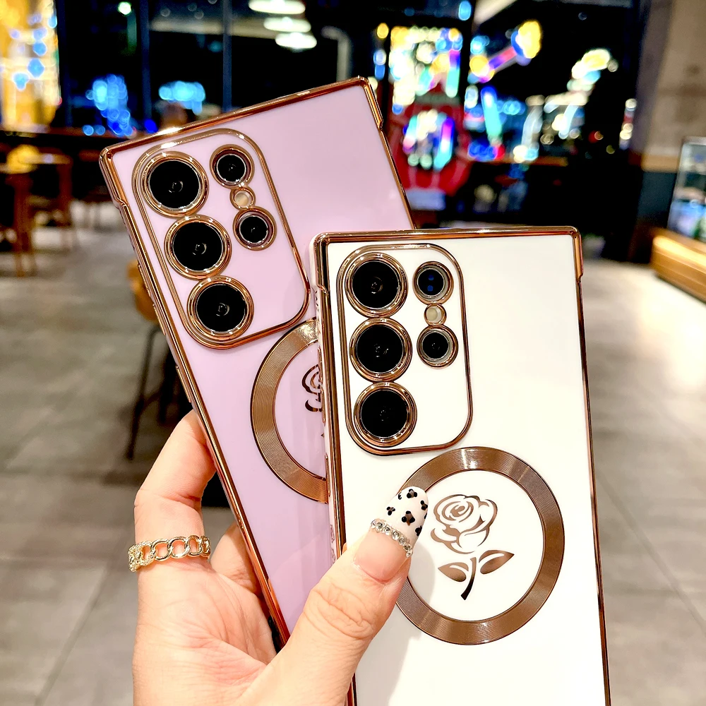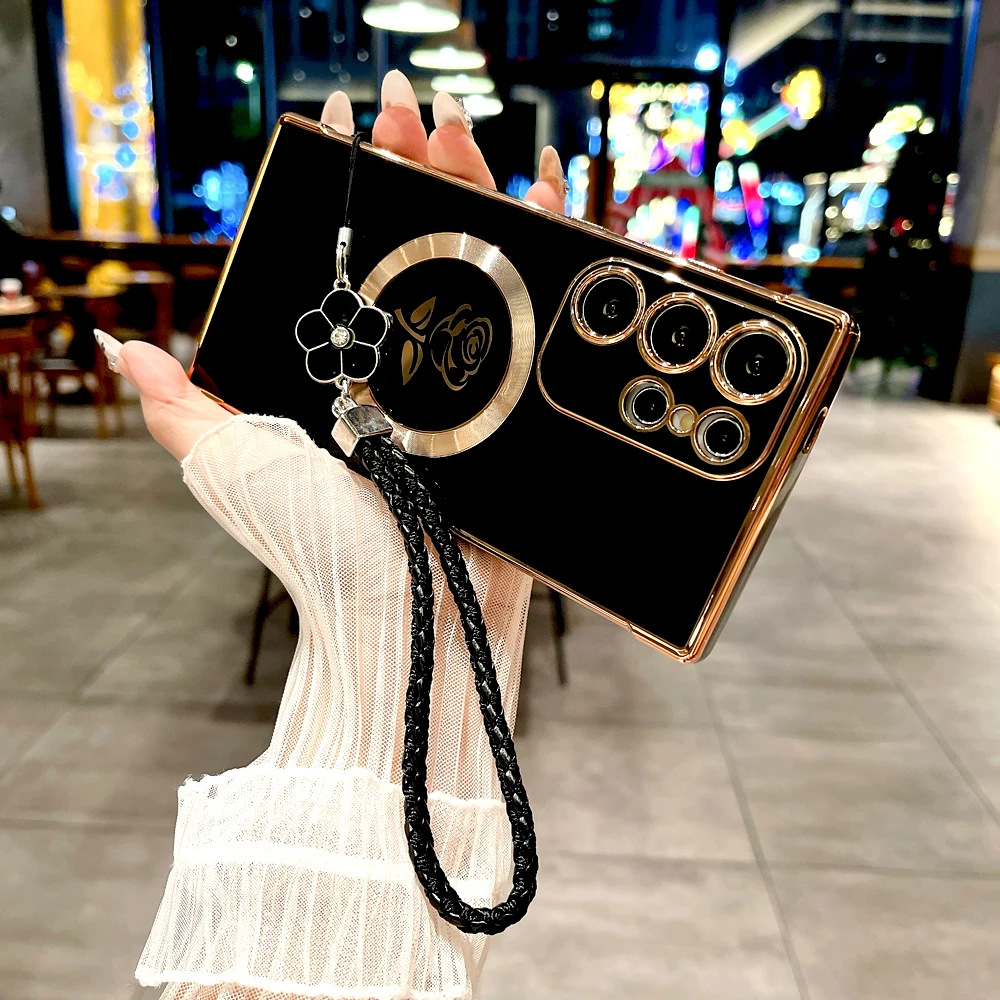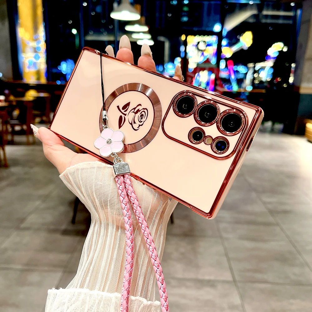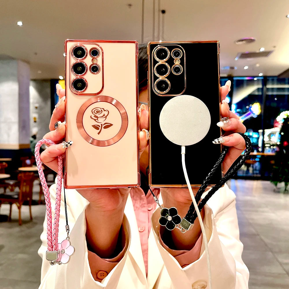 Plating Soft TPU Rose Case For Samsung Galaxy S25 S24 S23 S22 S21 Ultra Plus S25Ultra For Magsafe Charge Cover &Lanyard Bracelet