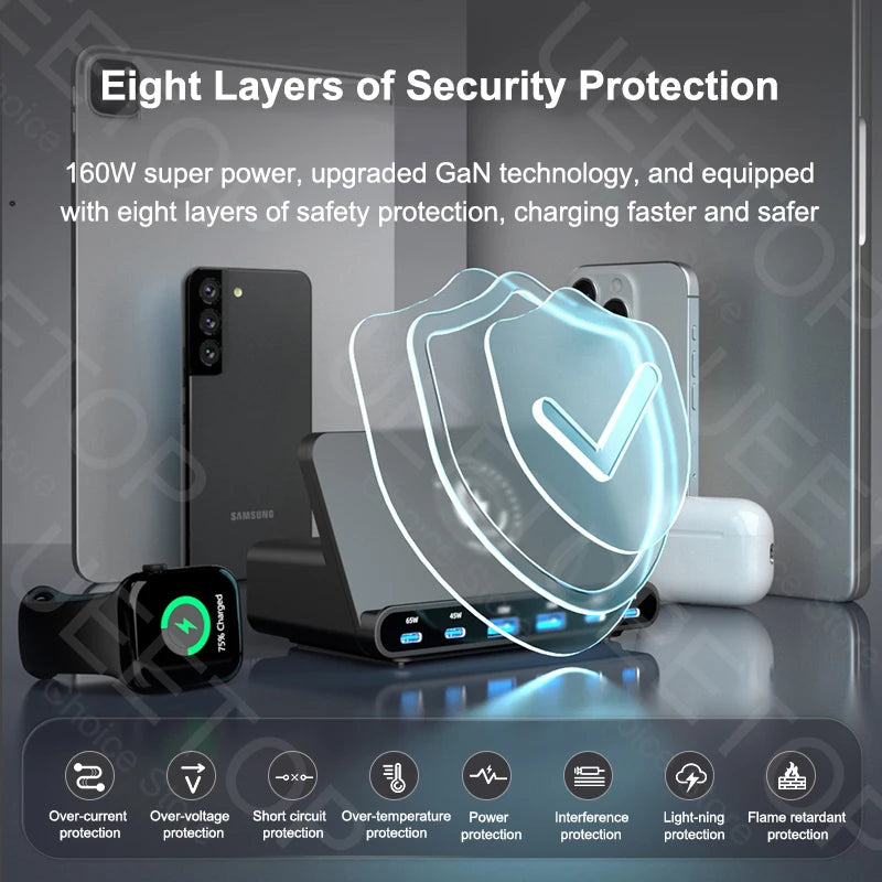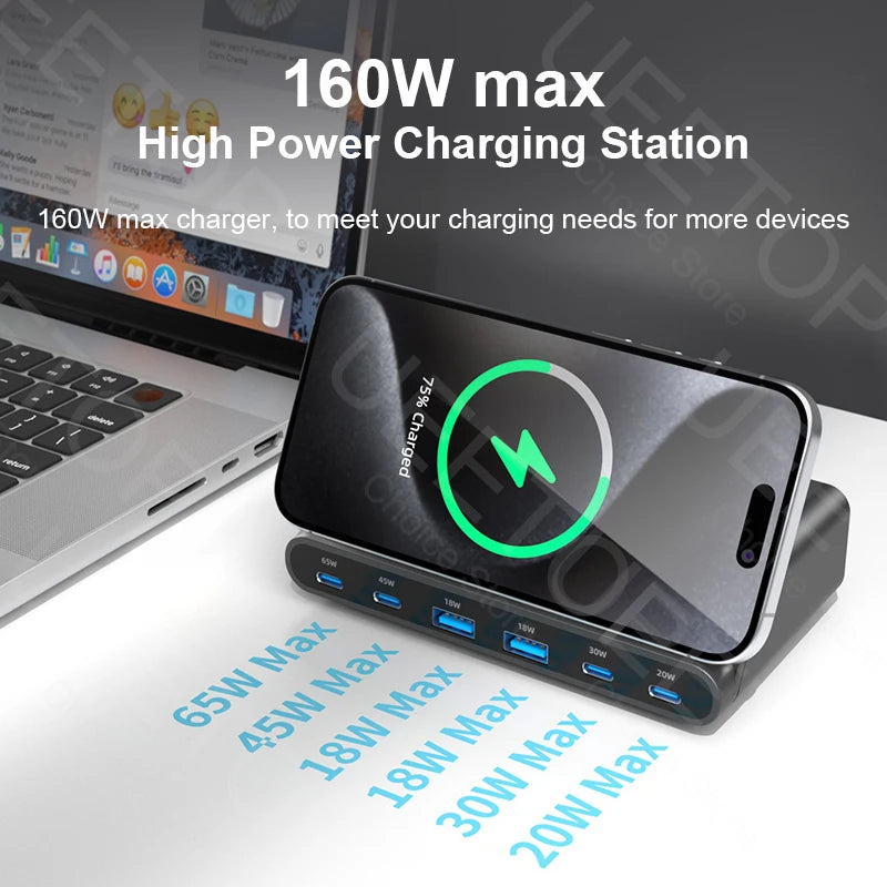Ueetop 160W USB Charging Station Wireless Charging 65W PD PPS 45W GaN Charger Quick Charger For Laptop Tablet iPhone 15 Samsung