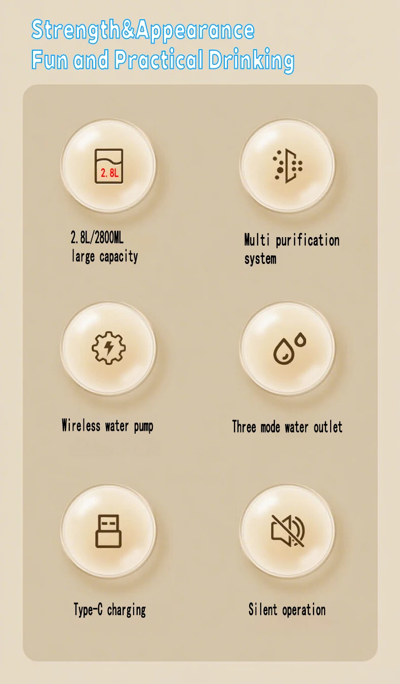 Product introduction:Made of ABS+food grade stainless steel, with three levels of water outlet mode, filter purification, 2.8L/2800ML water tank, brushless pump, sensing distance within 2 meters, TYPE-C charging port, anti dry burning setting, wireless design.