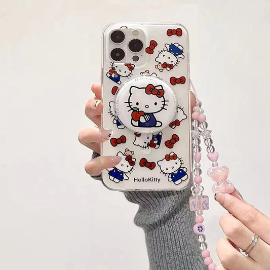Cute Hello Kitty Magnetic Grip Holder Magsafe Wireless Charge Phone Chain Case For iPhone 16 15 12 Pro Max 14 Plus 13 Mini Cover
