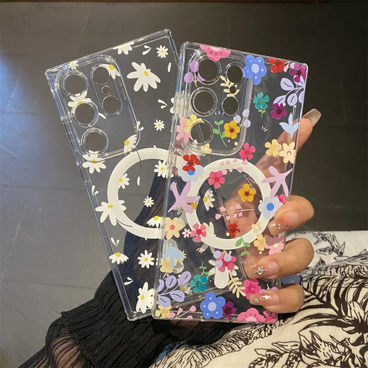 for Magsafe Cartoon Flower Case for Samsung Galaxy S23 S22 Ultra Note 20 S21 Plus Wireless Transparent Soft Shockproof TPU Cover