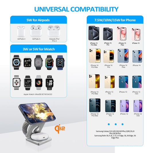 Qi2 3 in 1 15W Magnetic Wireless Charger for Iphone 16 15 14 13 Fast Charging Folding for Apple Watch Airpods Wireless Charger