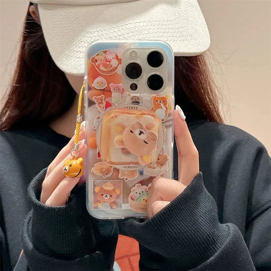 Funny Toast Dessert Bear Small Bell Magsafe Wireless Charge Case For iPhone 13 14 15 16 Pro Max Toast Rotate Bear Magnetic Stand