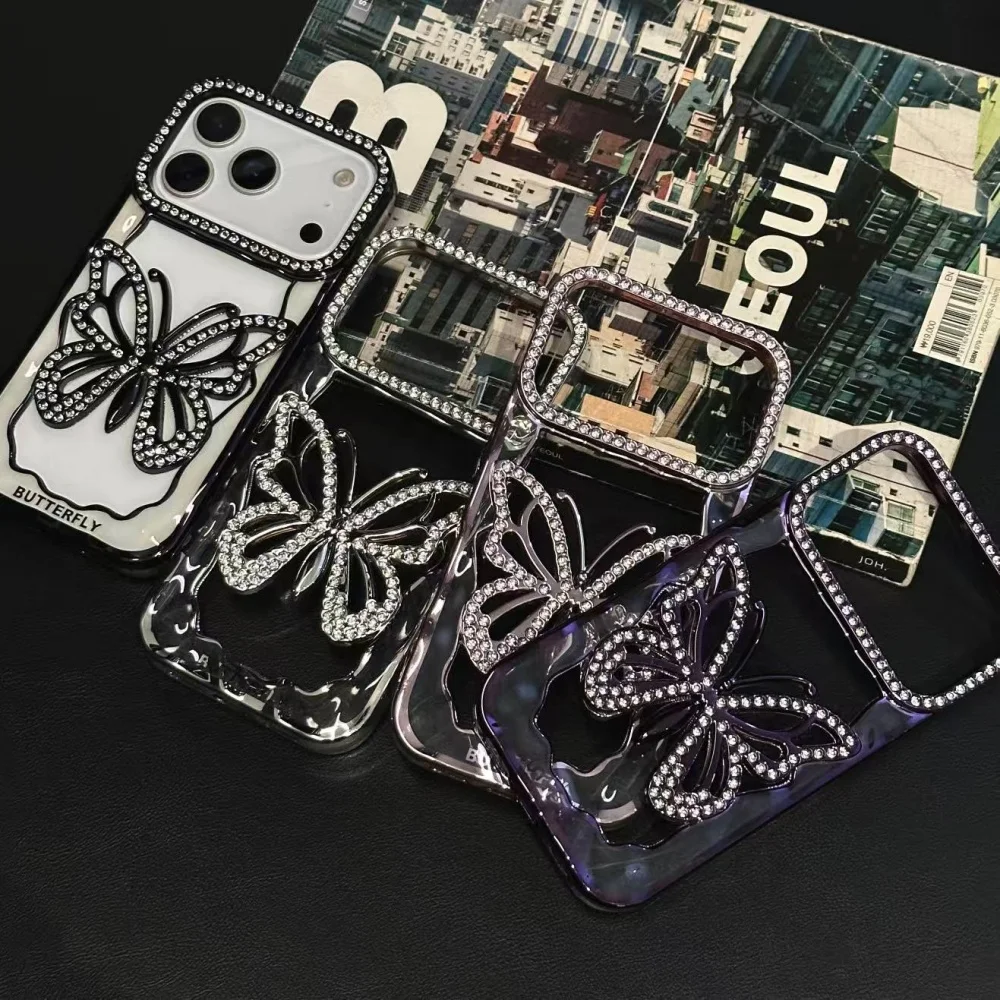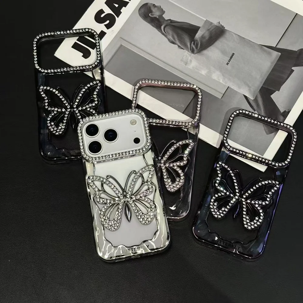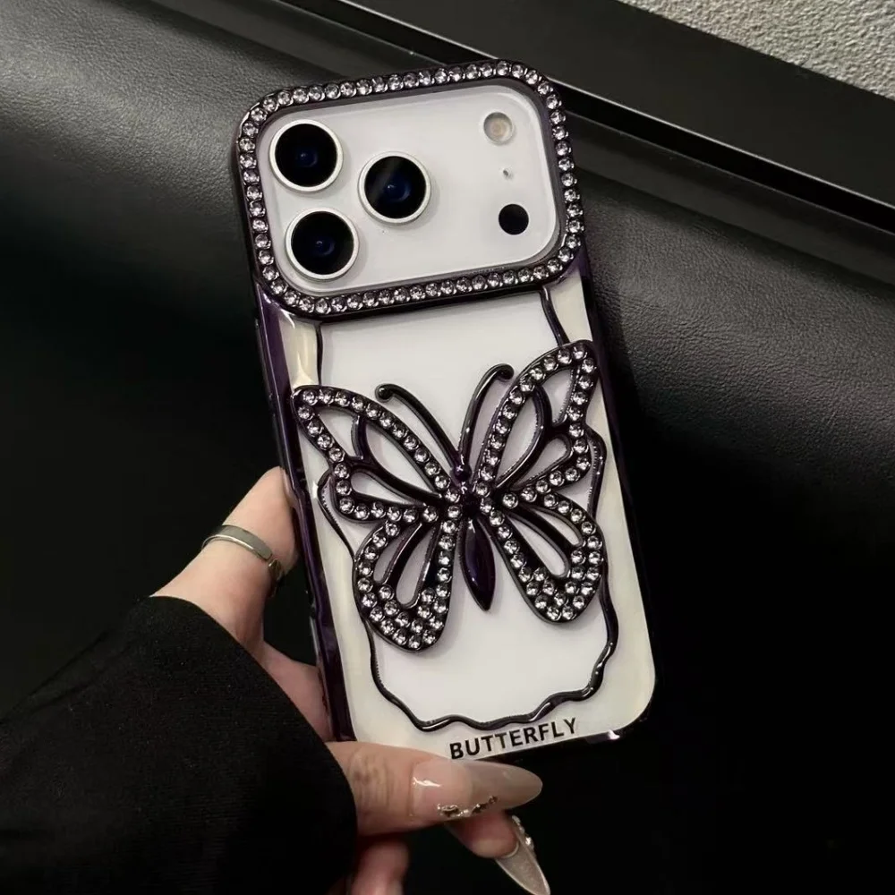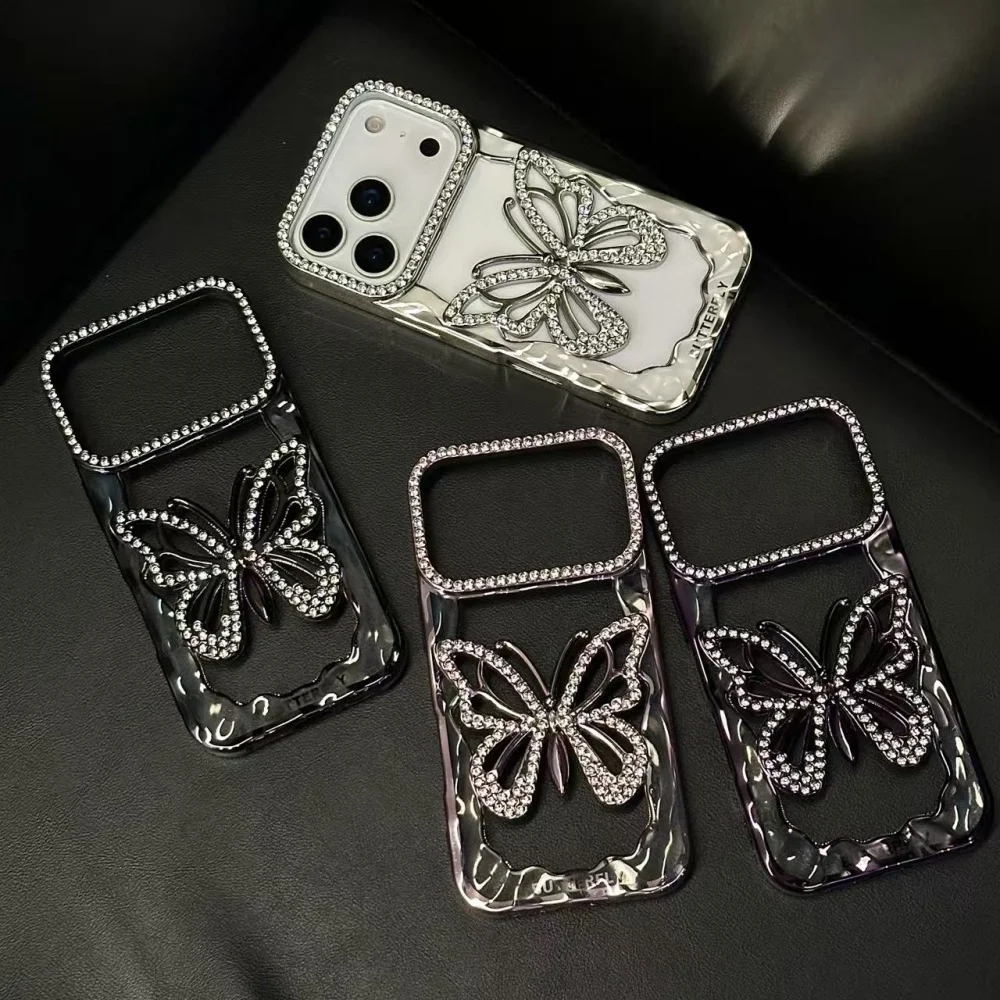 Plating Butterfly Hollow Glitter Diamond Case For iPhone 17 16 15 14 13 Pro Max Plus Bling Sparkling Rhinestone Shockproof Cover