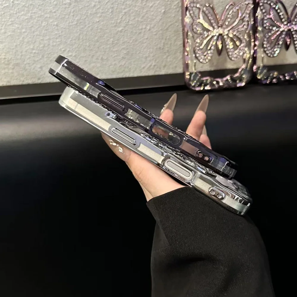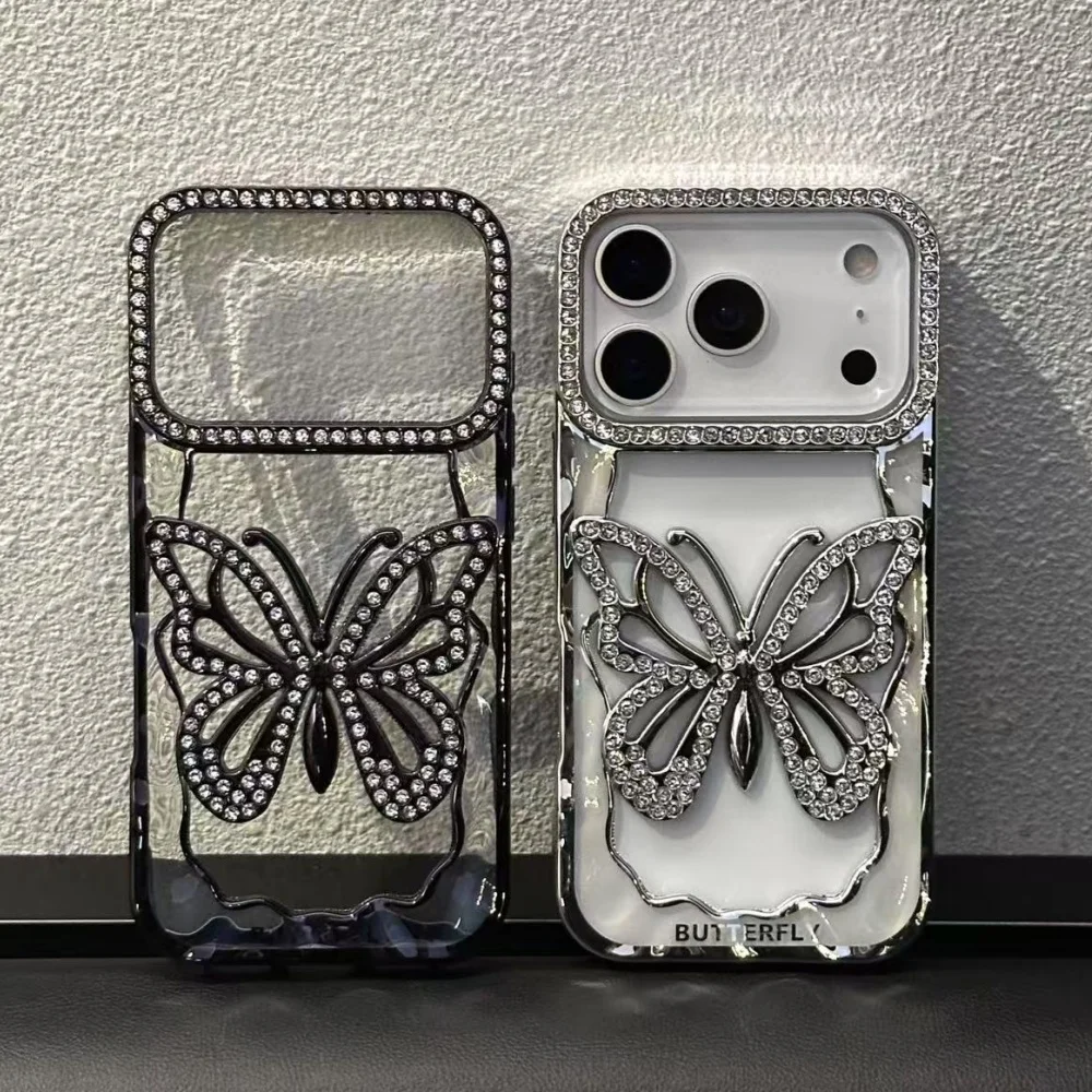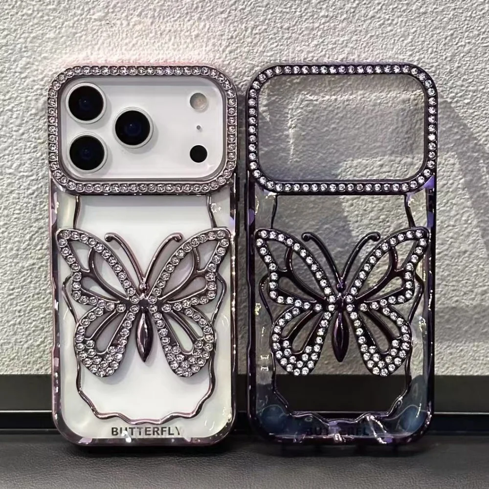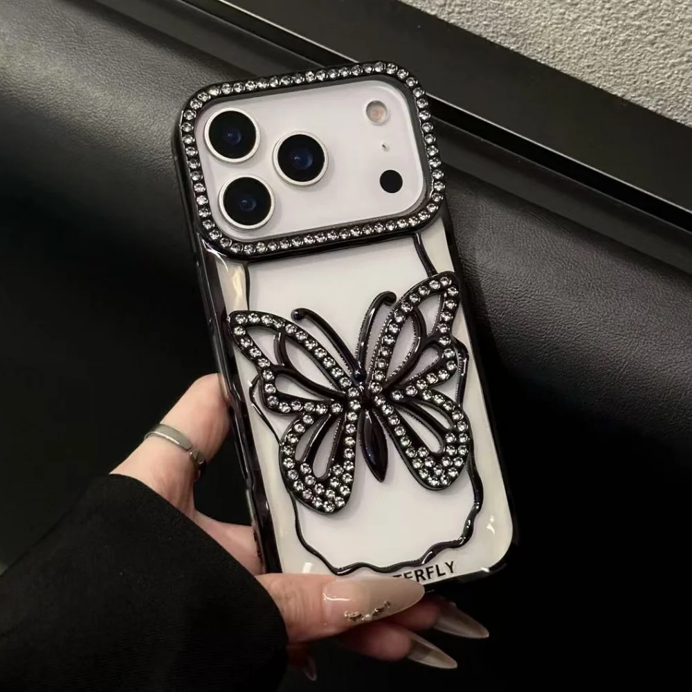 Plating Butterfly Hollow Glitter Diamond Case For iPhone 17 16 15 14 13 Pro Max Plus Bling Sparkling Rhinestone Shockproof Cover